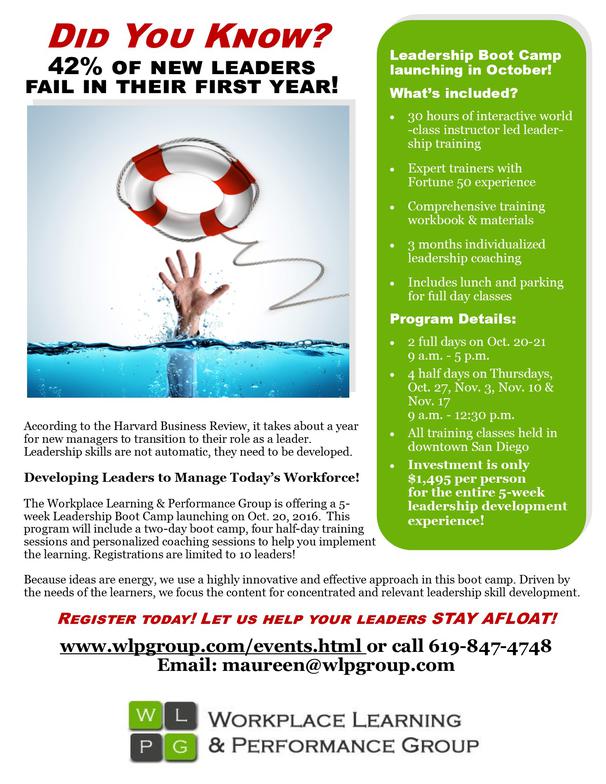 The Workplace Learning & Performance Group is offering a 5-week Intensive Leadership Boot Camp. This program includes a 5 week boot camp training and personalized coaching sessions to help you implement the learning and truly improve your skills as a leader.